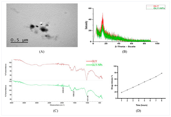 Structural characterization of the GLY-NPs. (A) The TEM image of GLY-NPs showed spherical to oval-shaped particles with sizes ranging between 50 and 135 nm (scale bar, 500 nm); (B) XRD patterns of GLY and GLY-NPs; (C) FTIR spectrum of GLY and GLY-NPs; and (D) in vitro release profile of GLY-NPs.
