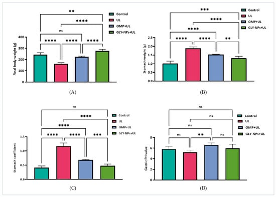 Effects of GLY-NPs and OMP on (A) final body weight, (B) stomach weight, (C) stomach coefficient, and (D) gastric pH in ethanol-induced GUs. The data represent the mean ± SEM (n = 6). Statistical comparisons were performed using one-way ANOVA followed by Tukey’s post hoc test. **** p < 0.0001, *** p < 0.001, ** p < 0.01, ns = not significant.