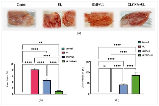 (A) The appearance and morphology of stomach tissue from each group, (B) ulcer index, and (C) ulcer inhibition (%). The data represent the mean ± SEM (n = 6). Statistical comparisons were performed using one-way ANOVA followed by Tukey’s post hoc test. **** p < 0.0001, ** p < 0.01, ns = not significant.