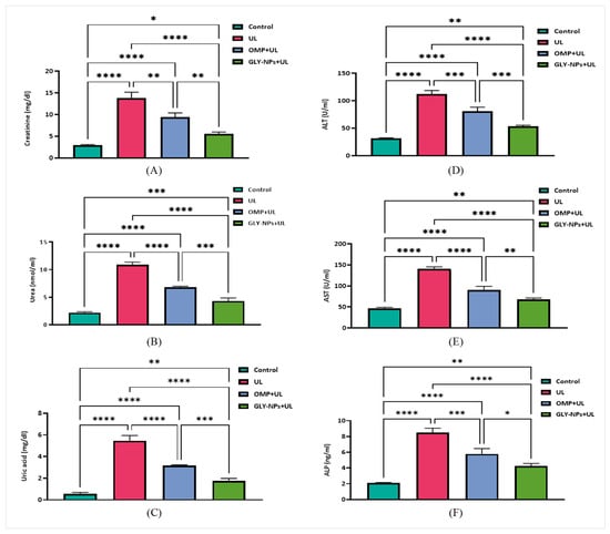 Regarding liver function, ALT activity significantly increased from 31.47 ± 0.64 U/mL in the control group to 111.9 ± 3.91 U/mL in the UL group (p < 0.0001). Administration with OMP decreased ALT to 80.77 ± 4.38 U/mL (p = 0.0004 compared to UL), while GLY-NPs administration dramatically reduced ALT levels to 53.34 ± 1.18 U/mL, which was statistically lower than OMP (p = 0.0009) and considerably different from the control (p = 0.0039) (Figure 5D).