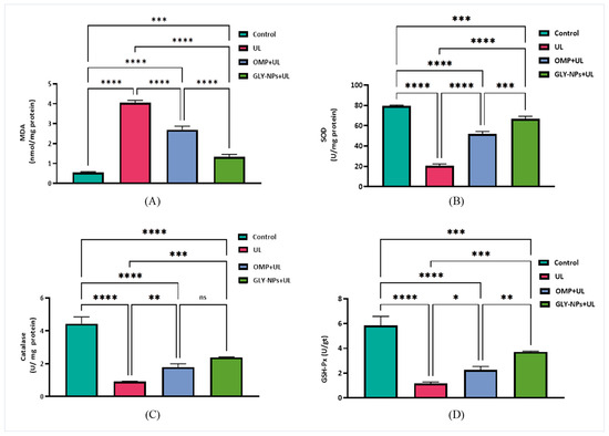 Effect of GLY-NPs and OMP on oxidative stress biomarkers and antioxidant levels in tissue homogenates in ethanol-induced GUs in rats: (A) MDA (nmol/mg protein), (B) SOD (U/mg protein), (C) Catalase (U/mg protein), and (D) GSH-Px (U/g tissue). Data are presented as mean ± SEM (n = 6). One-way ANOVA followed by Tukey’s post hoc test. * p < 0.05, ** p < 0.01, *** p < 0.001, **** p < 0.0001, and ns = not significant.
