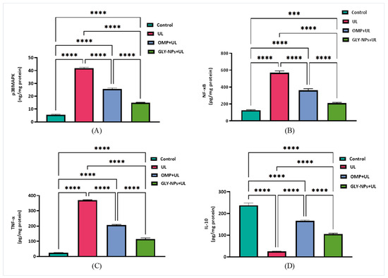 TNF-α was significantly increased in the UL group (369.5 ± 2.00 pg/mg protein) compared to the control group (23.17 ± 1.17 pg/mg protein; p < 0.0001). Both OMP and GLY-NPs administration dramatically decreased TNF-α levels to 205.9 ± 2.55 and 114.5 ± 4.17 pg/mg protein, respectively, with GLY-NPs exhibiting a pronounced anti-inflammatory impact (p < 0.0001 vs. OMP + UL) (Figure 7C). In contrast, IL-10 levels significantly decreased in the UL to 25.56 ± 0.74 pg/mg protein, in contrast to the control group (237.8 ± 6.02 pg/mg protein; p < 0.0001). Treatment with OMP partially restored IL-10 levels to 166.3 ± 2.07 pg/mg protein, but GLY-NPs dramatically elevated IL-10 concentration to 104.8 ± 2.48 pg/mg protein (Figure 7D).
