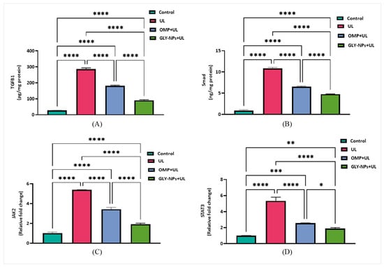 Regarding JAK2/STAT3, overexpression of both JAK2 and STAT3 was detected in the UL group relative to the control (p < 0.0001), with expression levels rising nearly 5.4-fold for each marker. Treatment with OMP slightly suppressed this activation, decreasing JAK2 expression to 3.43 ± 0.11 and STAT3 to 2.59 ± 0.01 (p = 0.0001 vs. UL). Also, GLY-NPs administration resulted in a significant reduction in JAK2 to 1.92 ± 0.06 and STAT3 to 1.90 ± 0.06 (p = 0.0001 vs. UL). Moreover, GLY-NPs demonstrated a markedly stronger inhibition of STAT3 expression compared to OMP (p = 0.0263) (Figure 8C,D), suggesting a possibly enhanced modulatory effect of GLY-NPs on inflammation-related signaling.