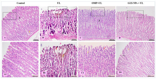 The stomachs of the control group of rats had normal architectures, without any indications of mucosal damage (Figure 10A,A1). The UL group had histological changes in gastric tissue, including significant ulcerative lesions of the epithelial layer, defined by the loss of the tunica mucosa, exfoliated cells, and degeneration of gastric glands (Figure 10B). Furthermore, hemorrhagic gastritis and inflammatory cell infiltration were present (Figure 10B1). Conversely, the OMP + UL group exhibited slight enhancement of the fundic mucosa, characterized by inflammatory cell infiltration and desquamation of the stomach mucosa (Figure 10C,C1). Meanwhile, GLY-NPs + UL preserved the histological architecture of gastric tissue and exhibited a thick mucus layer on the surface, with surface cells abundant in mucus and displaying distinct basal oval nuclei (Figure 10D,D1).