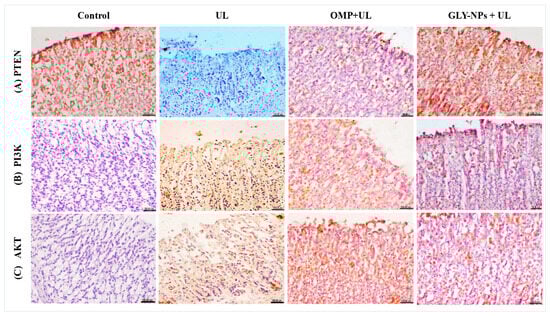 Immunohistochemical evaluation of PTEN, PI3K, and AKT exhibited increased expression of PTEN, but PI3K and AKT showed no expression in the stomach mucosa of the control group. In contrast, the UL group demonstrated a notable increase in PI3K and AKT expression, accompanied by the absence of PTEN expression in the tunica mucosa cells. Conversely, the OMP + UL group had weak PTEN expression and moderate PI3K and AKT immunoreactivity in the gastric mucosa., while the GLY-NPs group exhibited substantial PTEN expression along the epithelial lining of the lamina propria, with only minimal expression of PI3K and AKT (Figure 11A–C). These findings suggest a more favorable modulatory effect of GLY-NPs on the PTEN/PI3K/AKT pathway compared to OMP.
