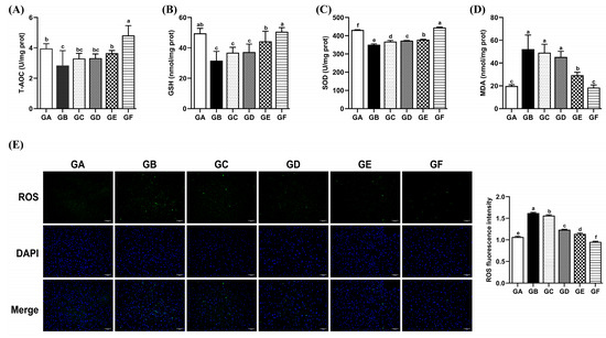 Compared to the control group, the model group exhibited significantly reduced levels of T-AOC, SOD, and GSH in the liver (p < 0.05), accompanied by significantly increased levels of MDA and ROS (p < 0.05). The GE group showed significant increases in T-AOC, SOD, and GSH levels (p < 0.05), along with significant decreases in MDA and ROS levels compared to the model group (p < 0.05). Moreover, the GF group demonstrated significantly higher levels of T-AOC and SOD than the control group (p < 0.05), while MDA and ROS levels were significantly lower than those in the control group (p < 0.05) (Figure 2A–E).