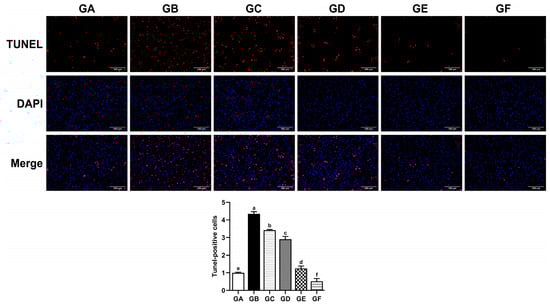 Compared to the control group, the liver apoptosis rate in the model group was significantly increased (p < 0.05), while the apoptosis rate in the GF group was significantly decreased (p < 0.05). The apoptosis rates in the DSPS treatment groups were significantly lower than those in the model group (p < 0.05) (Figure 4).