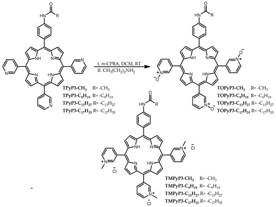 2.1.2. Preparation of N-Methylated Pyridiniumporphyrins (TMPyP3 with an Alkyl Chain) and Their Unmethylated/Unoxidised Precursors (TPyP3 with an Alkyl Chain)