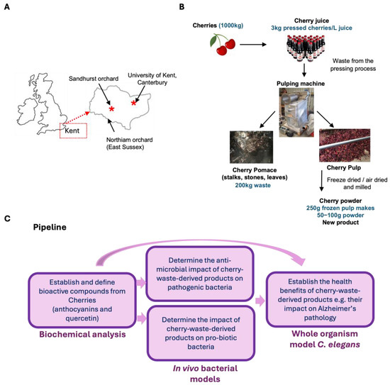 Pipeline for analysing products made from cherry waste. (A) Location of cherry orchards and the university campus in Kent, the United Kingdom. (B) Fresh (waste) cherries, otherwise destined for landfill, are pressed into juice using a pulping machine. Pulping also produces pomace and pulp, the latter of which is dried and milled into cherry powder. (C) Experimental pipeline to establish bioactive constituents and health benefits of cherry products.