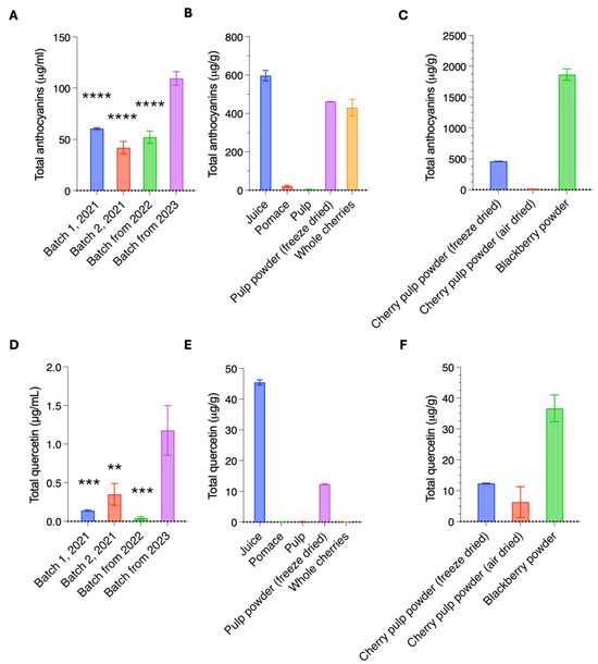Cherry products contain high levels of bioactive compounds. Total levels of anthocyanins in different batches of cherry juice (A) or products (B,C). Total levels of quercetin in different batches of cherry juice (D) or products (E,F). One representative of three technical replicates is shown for each sample. Error bars represent ± SEM. Statistical analysis was performed using one-way ANOVA, followed by Tukey’s post hoc test for multiple comparisons, comparing with Batch from 2023. ** p < 0.01, *** p < 0.001, **** p < 0.0001.