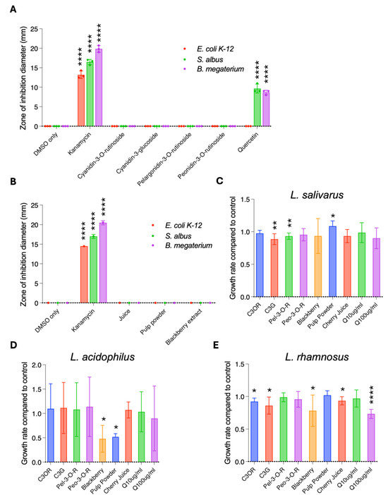 Cherry anthocyanins and products do not impact the growth of common pathogens and probiotics. (A,B) Kirby–Bauer disc diffusion susceptibility test on different bacterial strains, including common pathogens. Growth of bacteria is inhibited by quercetin but not by anthocyanins (100 µg/mL each) (A) or by cherry products (B). Statistical analysis by multiple unpaired t-tests, in comparison to DMSO control. (C–E) Maximum growth rates of probiotic bacteria. Individual anthocyanins at 50 µg/mL or cherry products themselves have minor or no effects on growth rates of L. rhamnosus or L. salivarus (C,D). The effect of anthocyanins, cherry products, and quercetin on the growth rate of L. rhamnosus, L. salivarious, and L. acidophilus is reduced by blackberry powder and cherry pulp powder. (E). Statistical analysis by Student’s t-test, two-tailed, homoscedastic. Error bars represent ± SEM. (A,B) One representative of three technical replicates is shown. (C,D) combined results from 5–10 biological replicates shown. * p < 0.05, ** p < 0.01, **** p < 0.0001.