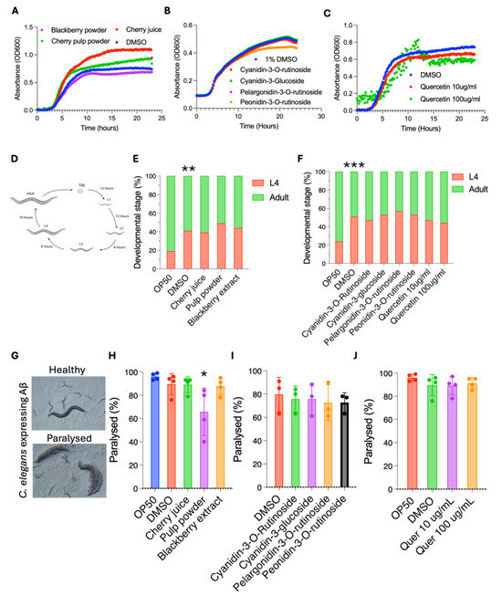 This demonstrates that none of the samples inhibit growth of OP50, and supplementing the C. elegans OP50 growth plates with them will not negatively impact their nutrient source. Some plant compounds can be toxic, so we next asked if the cherry samples have detrimental effects on C. elegans growth and development, both of which are good readouts of overall health. After hatching, C. elegans pass through four larval stages before becoming reproductively capable adults (Figure 4D). We measured the time it took for C. elegans treated with cherry products, blackberry powder, individual anthocyanins (100 µg/mL) or quercetin (10 µg/mL and 100 µg mg/mL) to pass through larval development and reach adulthood compared to controls. Consistent with other studies [19], the solvent control delayed development. We found that after 68 h, ~60% of C. elegans treated with the solvent control reached adulthood compared to ~80% of animals on OP50 only (Figure 4E,F). However, the addition of juice, pulp powder, blackberry extract, or individual compounds did not impact C. elegans development (Figure 4E,F). Together our data shows that the cherry products do not alter C. elegans growth, suggesting that they are non-toxic and making this model a viable option for conducting bioactivity assays.