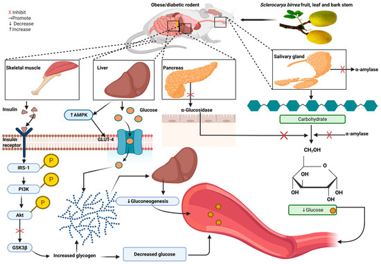 Proposed mechanism by which S. birrea ameliorates hyperglycemia [32]. S. birrea reduces hyperglycemia by inhibiting alpha-amylase and glucosidases. This action prevents the breakdown of carbohydrates into simple sugar molecules, resulting in reduced blood glucose levels. It also stores glucose as glycogen in the liver and skeletal muscle. Akt: protein kinase beta; IRS-1: insulin resistant substrate-1; GSK3-β: glycogen synthase kinase 3 beta; PI3K: phosphatidylinositol 3-kinase; AMPK: AMP-activated protein kinase; GLUT-4: glucose transporter type 4; PPAR: peroxisome proliferator-activated receptor. Figure was created using Biorender.