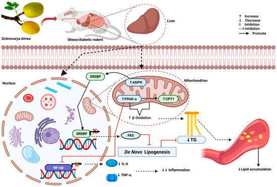 The possible mechanism by which S. birrea lowers inflammation and dyslipidemia [32,37]. SREBP: sterol regulatory element-binding protein 1, AMPK: AMP-activated protein kinase, CPT1: carnitine palmitoyl transferase 1, TG: triglyceride, FAS: fatty acid synthase, IL-6: interleukin-6, TNF-α: tumor necrosis factor alpha, NF-κβ: nuclear factor kappa beta. Figure was created via Biorender.