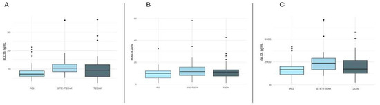 Plasma sCD36 levels were significantly higher in STE-T2DM patients compared to the T2DM and reference groups. Elevations of this marker have been linked to carotid intima-media thickening—a preclinical indicator of cardiovascular disease in both diabetic and non-diabetic individuals [16,29,30]. Nonetheless, its clinical role remains debated, as other studies have found no correlation between sCD36 and atherosclerosis imaging parameters [28].