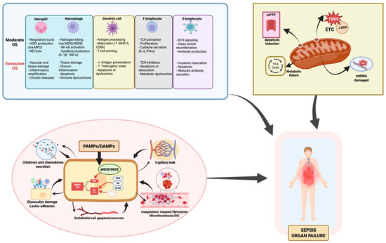Oxidative stress in sepsis: immune dysfunction, endothelial injury, and mitochondrial damage as drivers of functional organ failure. This figure summarizes how oxidative stress (OS) contributes to organ failure in sepsis through three main mechanisms: 1. Immune dysregulation. OS alters both innate and adaptive immune responses. While moderate ROS support pathogen clearance, antigen presentation, and cytokine release, excess ROS disrupt homeostasis, causing immune cell exhaustion, apoptosis, and dysfunctional signaling. The degree of immune impairment varies depending on the cell type and ROS load, affecting macrophages, neutrophils, T and B lymphocytes, and dendritic cells differently. 2. Endothelial injury. Excessive ROS disrupt the endothelial barrier, increasing vascular permeability and edema. ROS inhibit eNOS activity, reducing NO availability critical for vasodilation and vascular homeostasis. OS-induced endothelial activation upregulates adhesion molecules, promoting leukocyte adhesion and transmigration, exacerbating inflammation. This damage contributes to microvascular thrombosis, DIC, and impaired tissue perfusion, further driving organ dysfunction. 3. Mitochondrial Damage. Mitochondria are both a source and a target of ROS in sepsis. OS disrupts the mitochondrial respiratory chain, reducing ATP production and increasing mitochondrial ROS, creating a self-perpetuating cycle. mtDNA damage and loss of membrane potential, including mPTP opening, trigger the release of pro-apoptotic factors, leading to cell death. This mitochondrial dysfunction causes energy failure and metabolic impairment, key drivers of organ dysfunction in sepsis. Additionally, impaired mitophagy and biogenesis worsen mitochondrial damage, delaying recovery. Abbreviations: ATP: adenosine triphosphate; BCR: B cell receptor; CD86: cluster of differentiation 86; DAMPs: damage-associated molecular patterns; DIC: disseminated intravascular coagulation; eNOS: endothelial nitric oxide synthase; ETC: electron transport chain; H2O2: hydrogen peroxide; HOCl: hypochlorous acid; iNOS: inducible nitric oxide synthase; LOX: lipoxygenase; MHC-II: major histocompatibility complex class II; MPO: myeloperoxidase; mtDNA: mitochondrial DNA; mPTP: mitochondrial permeability transition pore; NADPH oxidase (NOX); NOX2: NADPH oxidase 2; NETosis: neutrophil extracellular trap formation; NF-κB: nuclear factor kappa-light-chain-enhancer of activated B cells; NO: nitric oxide; O2•−: superoxide anion; OH·: hydroxyl radical; ONOO−: peroxynitrite; OS: oxidative stress; PAMPs: pathogen-associated molecular patterns; ROS: reactive oxygen species; TCA cycle: tricarboxylic acid cycle; TCR: T cell receptor; XO: xanthine oxidase. Element related to endothelial dysfunction adapted from Ref. [16]; created in BioRender. Gomar, S. (2025) https://BioRender.com/m92v841, accessed on 20 August 2025.