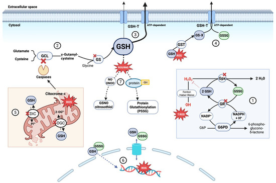 Mechanisms of intracellular glutathione (GSH) depletion and compartmentalization disruption during sepsis. During sepsis, GSH depletion contributes to redox imbalance and cell death through several converging mechanisms: (1) Increased oxidative stress accelerates GSH consumption by glutathione peroxidases detoxifying peroxides, forming GSSG. Although glutathione reductase recycles GSSG to GSH in an NADPH-dependent process, sustained stress overwhelms this system. (2) De novo GSH synthesis is impaired due to GLC degradation triggered by mitochondrial cytochrome c release and caspase activation, combined with limited availability of precursor amino acids (glutamate, cysteine, glycine). Glutathione synthetase activity may also be reduced due to oxidative modifications and altered expression during sepsis. (3) Enhanced ATP-dependent export of GSH via glutathione transporters (GSH-T) reduces intracellular GSH, disrupting redox balance. (4) Accumulated glutathione conjugates (GS-X)—formed by GSH binding to toxins and ROS via glutathione S-transferase (GST)—along with increased oxidized glutathione (GSSG) overwhelm ATP-dependent GSH-T, impairing export and causing intracellular accumulation that enhances oxidative damage. (5) Impaired mitochondrial glutathione compartmentalization, due to dysfunction of key carriers such as DIC and OGC, limits GSH import into the matrix. This results from oxidative damage, membrane depolarization, and inhibitory post-translational modifications. Consequently, mitochondria become dysfunctional, both generating ROS and becoming more susceptible to oxidative stress, which triggers permeability transition and disrupts ATP synthesis. (6) In sepsis, cytosolic redox imbalance promotes glutathione transport into the nucleus, reducing nuclear GSH and increasing GSSG levels, thereby enhancing oxidative damage to nuclear DNA. (7) Elevated reactive nitrogen species promote the formation of S-nitrosoglutathione (GSNO, a reservoir and scavenger of nitric oxide and peroxynitrite). In parallel, protein S-glutathionylation—where glutathione covalently binds to protein thiol groups (protein-SH)—protects proteins from irreversible oxidation and modulates their function. Both processes consume GSH, limiting its availability for antioxidant defense and aggravating oxidative stress in sepsis. Abbreviations: 2-OG2− (2-oxoglutarate anión), DIC (dicarboxylate carrier), G6PD (glucose-6-phosphate dehydrogenase), g6P (glucose-6-phosphate), GCL (glutamate-cysteine ligase), GS (glutathione synthetase), GSH (glutathione reduced form), GSH-T (ATP-dependent glutathione transporter), GST (glutathione S-transferase), GSSG (glutathione oxidized form), GS-X (glutathione conjugates), GSNO (S-nitrosoglutathione), GR (glutathione reductase), H+ (proton), H2O2 (hydrogen peroxide), NADP+ (nicotinamide adenine dinucleotide phosphate oxidized form), NADPH (nicotinamide adenine dinucleotide phosphate reduced form), NO (nitric oxide), OGC (2-oxoglutarate carrier), •OH (hydroxyl radical), Pi2− (inorganic phosphate anión), PSSG (protein S-glutathionylation) and ROS (reactive oxygen species). Adapted with permission from Ref. [121]. Copyright 2012 Mary Ann Liebert, Inc. Created in BioRender. Gomar, S. (2025) https://BioRender.com/m92v841, accessed on 20 August 2025.