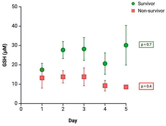 Time course of plasma GSH levels according to clinical outcome. Data are expressed as mean ± Standard Error of the Mean (SEM) (survivors: n = 54; non-survivors: n = 18).
