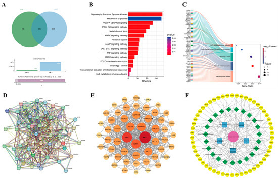 To understand the signaling pathways of the intersection targets, we performed WIKIPATHWAYS, REACTOME and KEGG functional analyses, identifying 1132 enriched pathways (Figure 1B). In addition to pathways such as Receptor Tyrosine Kinases, the metabolism of proteins, VEGFA VEGFR2 signaling and the PI3K-Akt signaling pathway, etc., we also found pathways related to mitochondrial function and autophagy, including the AMPK signaling pathway, FOXO-mediated transcription, mitophagy in animals, the transcriptional activation of mitochondrial biogenesis, and NAD metabolism, sirtuins, and aging. We selected the mitochondrial function and autophagy pathway as the core pathway and compiled the genes on the mitochondrial pathway as primary targets for further study (Figure 1C).