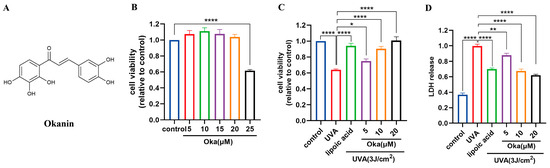 Okanin protects against the UVA-induced decrease in HaCaT cell viability. (A) The chemical structure of okanin. (B) HaCaT cell viability was evaluated using the MTT assay after incubation with different concentrations of okanin (n = 6). (C) HaCaT cells were treated with different concentrations of okanin and exposed to UVA (3 J/cm2) (n = 6). (D) LDH release (n = 6). Values are presented as the mean ± SEM. * p < 0.05, ** p < 0.01, **** p < 0.0001.