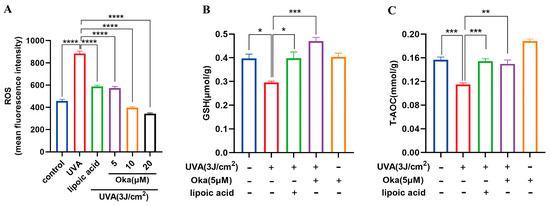 Relative to the controls, UVA exposure significantly decreased the GSH generation, while okanin treatment reversed the depletion of intracellular GSH (Figure 3B). These findings suggest that okanin mitigates UVA-induced ROS overproduction and improved T-AOC radiated (Figure 3C) might through improving GSH levels.