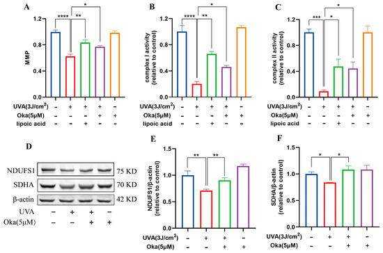 Okanin improves the mitochondrial function of UVA-induced HaCaT cells. (A) The HaCaT cells were incubated with JC-1 for the mitochondrial membrane potential (n = 5). (B,C) Activities of complexes Ⅰ and Ⅱ (n = 5). (D) Representative bands of NDUFS1 and SDHA proteins. The corresponding quantification of NDUFS1 (E) and SDHA (F). Values are presented as the mean ± SEM. * p < 0.05, ** p < 0.01, *** p < 0.001, **** p < 0.0001.