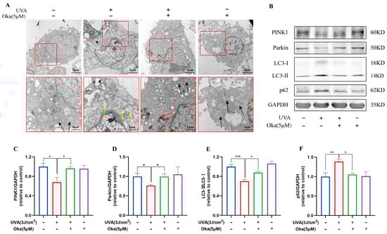 Okanin improves the mitochondrial function of UVA-induced HaCaT cells. (A) Mitochondria ultrastructure changes after UVA irradiation by TEM scanning (scale bars: 2 μm and 1 μm). The yellow arrow indicates severe mitochondrial vacuolation within cells. The black arrow indicates normal mitochondria. The red arrow indicates the autophagosome engulfment of damaged mitochondria. (B) Representative bands of PINK1, Parkin LC3 and p62 proteins. The corresponding quantification of PINK1 (C), Parkin (D), LC3 (E) and p62 (F). Values are presented as the mean ± SEM. * p < 0.05, ** p < 0.01, *** p < 0.001.