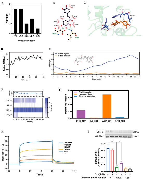 The interaction of okanin with SIRT3. (A) The docking score distribution diagram of okanin and 17 crystal structures of SIRT3. (B) The 2D interaction structures between okanin and SIRT3. Hydrogen bonds are shown as green dotted lines, while the spoked arcs represent residues making nonbonded contacts with the ligand. (C) The 3D interaction structures between okanin and SIRT3. (D) The Root Mean Square Deviation (RMSD) of the SIRT3 backbone. (E) The Ligand Root Mean Square Fluctuation (L-RMSF) of okanin in SIRT3. (F) The interactions between key residues and SIRT3 during the whole simulation process. (G) The main interaction fractions between okanin and SIRT3. (H) The binding affinity between okanin and SIRT3, with KD = 4.977 × 10−6. (I) The direct interaction between SIRT3 and okanin was studied by using a DARTS assay. Values are presented as the mean ± SEM. * p < 0.05, ** p < 0.01.