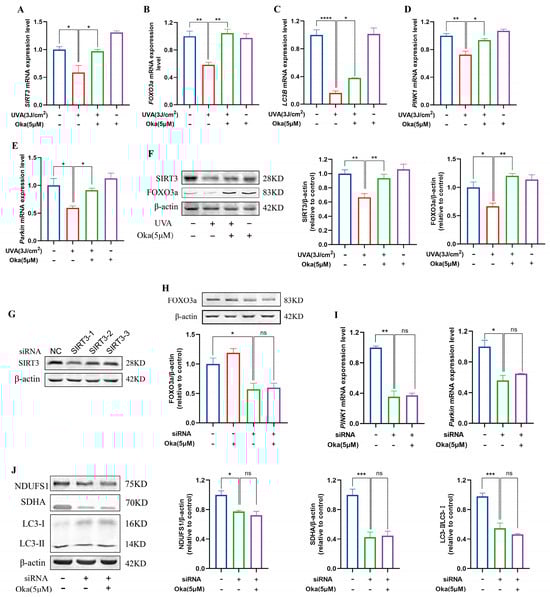 The effect of okanin on the SIRT3/FOXO3a signaling pathway. (A–E) The mRNA expression levels of SIRT3, FOXO3a, LC3B, PINK1, and Parkin were quantified by RT-PCR (n = 3). (F) The expression levels of SIRT3 and FOXO3a proteins. (G) siRNA inhibited the expression of the SIRT3 protein in HaCaT cells. The expression of the FOXO3a protein (H), and the expression of PINK1 and Parkin mRNA (I) after SIRT3 knockdown using siRNA. (J) The expression of NDUFS1, SDHA and LC3-II/I proteins after SIRT3 inhibition. Values are presented as the mean ± SEM. * p < 0.05, ** p < 0.01, *** p < 0.001, **** p < 0.0001.