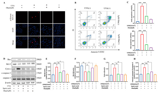 In addition, it has been reported that cellular apoptosis is related to the regulation of Parkin-mediated mitophagy [49]. Mitochondrial dysfunction contributes significantly to pro-apoptotic protein release, including cytochrome C, which activates caspase proteins and induces apoptosis [50]. Many studies have found that UVA-induced cell apoptosis is related to the mitochondria-dependent (intrinsic) apoptotic pathway. In addition, UVA upregulates caspase-3 and caspase-9 expression, leading to relevant DNA damage [51]. This apoptosis process is mediated by Bcl-2 family proteins, particularly through the proapoptotic Bax and antiapoptotic Bcl-2/Bcl-xL [52]. In our findings, okanin exhibited protective effects against UVA-induced damage in HaCaT cells by alleviating cytochrome C release, enhancing Bcl-2 expression, and suppressing Bax and caspase-3 levels. The results of flow cytometry also demonstrated that okanin could improve UVA-induced apoptosis. The immunofluorescence analysis of HaCaT cells using Phospho-Histone H2A.X showed an increase in positive cells after UVA irradiation but a decrease in positive cells after okanin treatment.