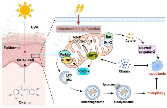 In summary, in this study, we illustrated an important mechanism whereby okanin protected UVA-induced HaCaT cells from apoptosis and mitochondrial dysfunction, and this function was relevant to the clearance of the impaired mitochondria through partially regulating SIRT3/FOXO3a/PINK1/Parkin-mediated mitophagy (Figure 10). However, this study has several limitations that warrant consideration. When we explored the protective effect of okanin on mice exposed to UV radiation, our observations were primarily confined to the intuitive changes in the skin, as well as the histological level, and failed to further explore its underlying mechanism. In conclusion, the results indicated the potential of okanin as an active ingredient in skincare formulations, including skin creams, promoting the repair of skin under ultraviolet radiation.