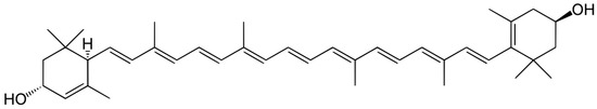 Lutein belongs to the xanthophyll group of carotenoids—pigments produced by plants and photosynthetic bacteria [,,]. It is a potent antioxidant due to its peculiar structure—the extended system of conjugated double bonds (Figure 2). The lutein molecule contains two terminal hydroxyl groups, which makes it more hydrophilic. Like other xanthophylls, zeaxanthin and lutein efficiently quench singlet oxygen and lipid peroxyl radicals [,,].