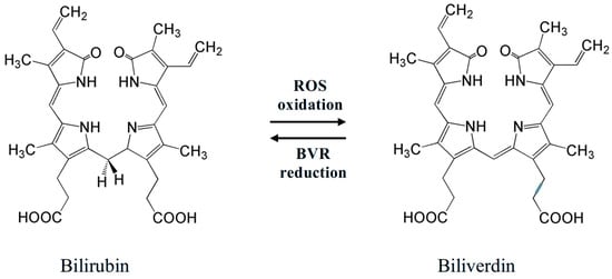 Bilirubin is a potent serum antioxidant playing an important role in protection from ROS. Its antioxidant action consists of redox reactions with ROS to give biliverdin, which is again reduced to bilirubin by BVR (Figure 3). Incorporating into cells, bilirubin can protect cell membranes from oxidation of lipids by ROS [,,]. The physiological redox homeostasis of the vascular endothelium is determined by the antioxidant activity of bilirubin, which may be a dynamic factor in endothelial function []. In addition, erythroid-2-related factor 2 (Nrf2), which takes part in antioxidant activities in cells of mammals, can be activated by excessive levels of bilirubin, causing oxidative stress []. By triggering several antioxidant genes, such as HO-1, NADPH quinone oxidoreductase, glutamate-cysteine ligase catalytic and modulatory subunits, glutathione S-transferase A2, glucose-6-phosphate dehydrogenase, 6-phosphogluconate dehydrogenase, and the cystine transporter SLC7A11, this transcription factor maintains redox homeostasis [].