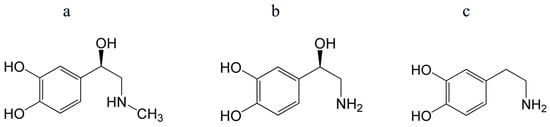 Structures of epinephrine (adrenaline) (a), norepinephrine (noradrenaline) (b), and dopamine (c). Their antioxidant properties are mostly determined by a catechol (phenol) group.