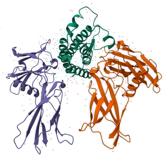 The main protein in the body throughout human ontogenesis is human serum albumin (HSA), a globular protein having a molecular mass of about 66 kDa, which is the main component of human blood serum [,,] (Figure 7).