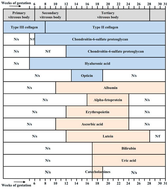 Hyaluronic acid (nonsulfated glycosaminoglycan), the main component of the vitreous, was found in it from the 5th week of embryonic development. Sulfated glycosaminoglycans, on the other hand, are temporarily present in the vitreous from the 6th to 40th week of gestation. Collagens also change during human embryonic development: type III collagen was found in the vitreous up to the 8th week, whereas type II collagen becomes the main collagen from 8 weeks throughout the further human life []. The vitreous of 19-week human fetuses contains type IV and type XVIII (heparan sulfate proteoglycan) collagens []. The fetal vitreous was also shown to contain opticin, a member of the extracellular matrix family that belongs to leucine-rich repeat proteins/proteoglycans []. The regulation of fibril diameter and interfibrillar spacing is the biological role of opticin in vivo []. The vitreous is composed of a network of thin collagen fibrils (collagens of types II, IX, and V/XI), which are important for maintaining its structure. Opticin plays a role in the fibrillogenesis of collagens for creating the vitreous gel and may also play a role in preserving the distance between the vitreous collagen fibrils [].