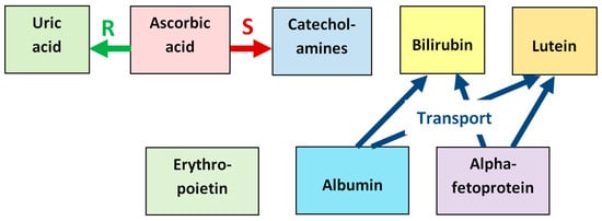 The literature search was carried out, collecting information on antioxidant molecules found in the vitreous of the human eye (ascorbic acid, bilirubin, carotenoids, uric acid, catecholamines, erythropoietin, albumin, alpha-fetoprotein, etc. and those mentioned in []) from various Internet databases (Web of Sciences, Scopus, PubMed, Medline, Ovid). The search was also carried out using the following keywords: vitreous body; reactive oxygen species; antioxidants; human eye; and prenatal development.