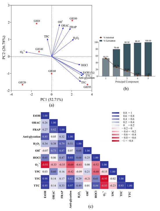 The study of parametric analysis for GIE and determination methods: (a) Principal component analysis (PCA) of studied parameters. (b) Proportion of variance in PCA, both individually and cumulatively (c). Heat map of Pearson’s correlation coefficient matrix. The analytical data served as the standard equivalent of 1 g extract, and Pearson’s correlation coefficient was utilized with a significance threshold of p < 0.05.