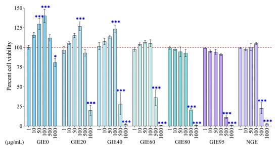 The toxicity of extracts to fibroblast cells was determined using a MTT cell viability assay. Treatment with GIE (0–95) and NGE at 1–100 µg/mL dosages for 24 h had no harmful effects on HDFa cells until exceeding 500 µg/mL (Figure 2). Compared to the vehicle-treated group (100%), GIE0 (130 ± 7% and 140 ± 8%) and GIE20 (115 ± 3% and 126 ± 6%) exhibited an increase in cell viability at concentrations of 50 and 100 µg/mL. We utilized GIE0, GIE80, GIE95, and NGE in our investigation of the preventative effect of GIE on fibroblast oxidative stress since they demonstrated strong antioxidant capacity using PCA and antioxidant activity methods. Referring to their toxic effect, concentrations ranging from 1 to 100 µg/mL were chosen for this study.