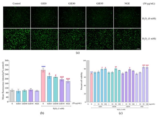 Preventive effect of GIE and NGE on H2O2-induced fibroblast oxidative stress and cell viability. (a) Representative picture of intracellular ROS, identified by DCFH-DA green fluorescence. (b) Effects of GIE and NGE on intracellular ROS production induced by H2O2. (c) Effects of GIE and NGE on H2O2-decreased cell viability. Data are presented as mean ± SEM of n ≥ 3. *** p < 0.001 when compared to the vehicle-treated group; # p < 0.05, ## p < 0.01, and ### p < 0.001 when compared to the H2O2-challenged group.