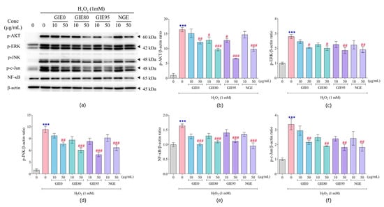 Effect of GIE and NGE pretreatment on p-AKT, p-ERK, p-JNK, NF-κB, and p-c-Jun signaling pathways in H2O2-induced fibroblast cell signaling changes in fibroblast cells exposed to H2O2. (a) Representative Western blot bands of each signaling protein. (b) p-AKT/β-actin. (c) p-ERK/β-actin. (d) p-JNK/β-actin. (e) NF-κB/β-actin. (f) p-c-Jun/β-actin. Data are presented as mean ± SEM of n ≥ 3. *** p < 0.001 when compared to the vehicle-treated group; # p < 0.05, ## p < 0.01, and ### p < 0.001 when compared to the H2O2-challenged group.