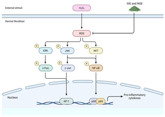 In summary, GIE0, GIE80, GIE95, and NGE showed the most antioxidant capacity and were chosen to examine the preventive effect on fibroblast cell oxidative stress, analyzed by PCA. The scavenging activities of GIE and NGE play a critical role in maintaining the balance of excessive ROS and ensuring redox homeostasis, which are the key mechanisms for preventing fibroblast inflammation and damage caused by oxidative stress. The redox chain of the MAPK/AP-1/NF-κB and PI3K/AKT/NF-κB signaling cascades is disrupted by a decrease in ROS accumulation, resulting in a decline in the production of inflammatory cytokines. This, in turn, reduces inflammation and injury in fibroblasts (Figure 5). GIE and NGE show potential advantages in mitigating fibroblast inflammation and injury in a model of oxidative stress induced by H2O2. We suggest the utilization of GIE0, GIE80, GIE95, and NGE for antioxidant purposes, whereas the application of GIE80 and GIE95 in terms of anti-glycation needs further research. More advanced in vivo and clinical research is required to clarify the efficacy of these dietary supplements in preventing fibroblast damage, skin aging, or cancer-associated fibroblasts.