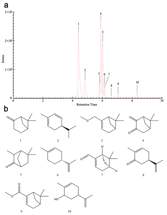 Figure 1. GC-MS was used to identify the main chemical components in SXC. (a) GC-MS chromatograms of ten compounds and a mixed standard solution of SXC. (b) beta-pinene, alpha-phellandrene, methyl myrtenyl ether, pinocarvone, iso-pinocarvone, limonene, myrtenal, carvone, methyl myrtenate, and carveol, pinocarvone, isopinocamphone, (+)-limonene, (+/−)-myrtenal, (−)-carvone, methyl myrtenate, and carveol. Chemical structure of the ten components.
