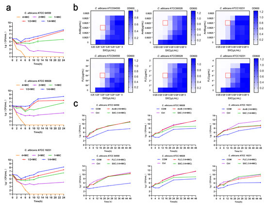 Figure 2. In vitro antifungal activity of AmB-SXC and FLC-SXC combinations against C. albicans strains. (a) Time–kill curves of SXC against C. albicans strains (n = 3). (b) Checkerboard analysis of AmB-SXC and FLC-SXC combinations. OD600 values were measured using a microplate reader and visualized as a color gradient (dark purple: growth; white: no growth). Red boxes indicate combinations with the highest synergistic activity. (c) Time–kill curves of C. albicans strains treated with AmB-SXC and FLC-SXC combinations at fractional inhibitory concentration index (FICI) concentrations (n = 3).