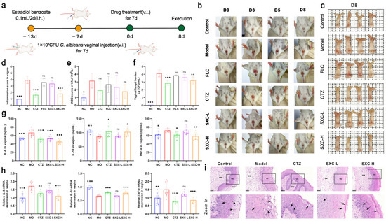 We initially established a VVC mouse model and validated the protective effects of SXC, with the experimental timeline illustrated in Figure 3a. Briefly, VVC was established by priming with estradiol, followed by Candida inoculation 1 week before treatment, and continuous observed these animals for 8 days post drug application. We used the drug-resistant strain ATCC 64550 to mirror refractory VVC cases. This setup helps prove SXC’s efficacy in treatment-resistant scenarios. The ATCC 64550 strain is resistant to FLC, so FLC treatment had no effect (Figure 3b–f), while CTZ is effective and therefore served as a positive drug.
