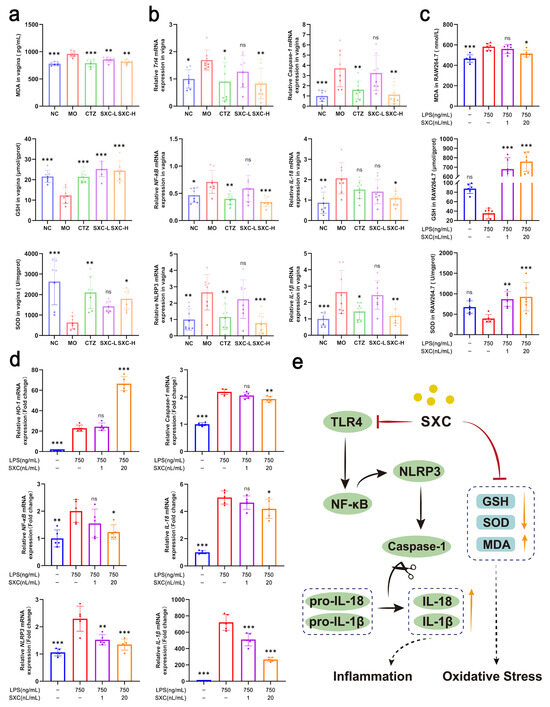 Figure 4. SXC treats VVC mice by exerting antioxidant effects and suppressing the NLRP3 pathway to produce anti-inflammatory actions. (a) Levels of GSH, SOD, and MDA in vaginal tissues (n = 7). (b) mRNA transcript levels of TLR4, NF-κB, NLRP3, Caspase-1, IL-18 and IL-1β in vaginal tissues measured via RT-qPCR (n = 8). (c) Levels of GSH, SOD, and MDA in the supernatant of LPS-stimulated RAW264.7 cells (n = 6). (d) mRNA transcript levels of inflammatory cytokines HO-1, NF-κB, NLRP3, Caspase-1, IL-18 and IL-1β in LPS-stimulated RAW264.7 cells (n = 6). Statistical significance is indicated as follows: * p < 0.05, ** p < 0.01, *** p < 0.001, compared to the model group; ‘ns’ denotes not significant. (e) SXC suppresses oxidative stress and pyroptosis by inhibiting the TLR4/NF-κB/NLRP3 signaling pathway.