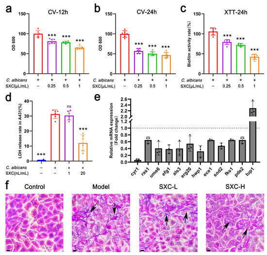 Figure 5. SXC inhibits C. albicans biofilm formation and reduces its adhesion to A431 cells. (a) Inhibitory effect of SXC on C. albicans biofilm formation at 12 h and 24 h, assessed by crystal violet assay (n = 6). (b) Disruptive effect of SXC on mature C. albicans biofilms (24 h-old), measured by crystal violet assay (n = 6). (c) Metabolic activity of mature C. albicans biofilms after SXC treatment, evaluated by XTT assay (n = 6). (d) LDH release rate in cell culture supernatants (n = 6). Statistical significance is indicated as follows: *** p < 0.001, compared to the model group; ‘ns’ denotes not significant. (e) Effect of SXC on biofilm-related gene expression. Expression of biofilm-associated genes was detected via quantitative reverse transcription polymerase chain reaction (RT-qPCR) (n = 3). C. albicans untreated with SXC served as the NC group. Gene expression was normalized to 18S rRNA levels in each sample, with NC group expression set to 1 for each gene. (f) Gram staining of C. albicans hyphae adherent to A431 cells. Scale bar = 50 μm. The arrow indicates the formation of fungal hyphae.