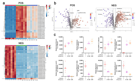 Figure 6. Metabolic effects of SXC on Candida albicans. (a) Metabolomics heatmap of C. albicans after SXC treatment (n = 6). (b) Metabolomics volcano plot of C. albicans after SXC treatment (n = 6). (c) Content plot of significantly different metabolites (n = 6).