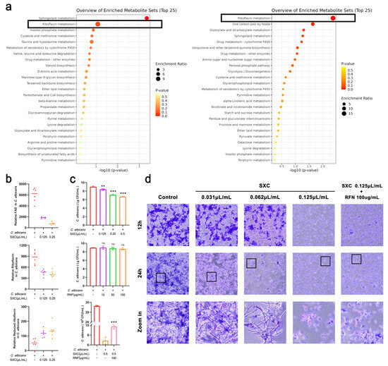 Figure 7. SXC modulates C. albicans growth and hyphal formation by affecting riboflavin metabolism. (a) KEGG pathway enrichment analysis of cationic and anionic metabolites in C. albicans. (b) Levels of riboflavin, reduced flavin, and flavin adenine dinucleotide (FAD) in C. albicans metabolites (n = 6). (c) C. albicans biomass after 24-h treatment: SXC (0.5 μL/mL), Riboflavin (100 μg/mL), SXC (0.5 μL/mL) + riboflavin (100 μg/mL) supplementation (n = 3). Statistical significance is indicated as follows: ** p < 0.01, *** p < 0.001, compared to the model group; ‘ns’ denotes not significant. (d) Crystal violet staining of hyphal formation: SXC (0.031, 0.062, 0.125 μL/mL) treatment groups. SXC (0.125 μL/mL) + riboflavin (100 μg/mL) rescue group. Scale bar = 100 μm.