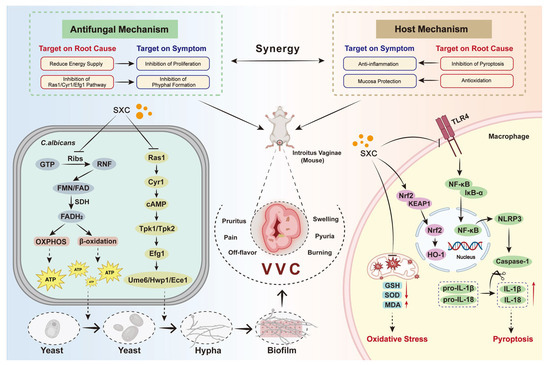 Figure 8. Mechanistic conclusion. SXC employs a dual therapeutic strategy against VVC by simultaneously addressing symptomatic relief and treating the root causes. For symptomatic management, SXC exhibits direct antifungal activity through inhibiting Candida replication, hyphal development and biofilm formation. At the same time, it mitigates host inflammation, to alleviate mucosal irritation. Beyond symptom control group, SXC targets root causes by disrupting fungal energy metabolism—reducing riboflavin availability to starve pathogens, downregulating Ras1-mediated hyphal/biofilm pathways, and counteracting oxidative stress and pyroptosis in host cells. This dual-action approach offers a comprehensive therapeutic profile that combines rapid symptom alleviation with sustained anti-relapse potential, making SXC a potential remedy for clinical refractory VVC.
